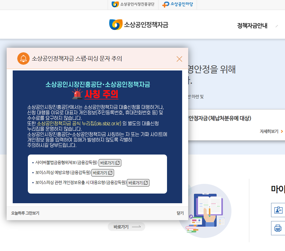 소상공인시장진흥공단 홈페이지에 접속하시면 메인페이지에서 사칭주의라는 팝업이 눈에 띄입니다.