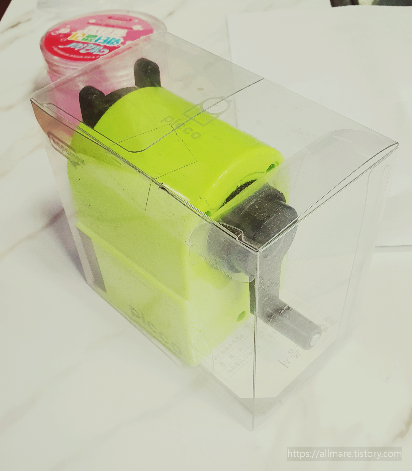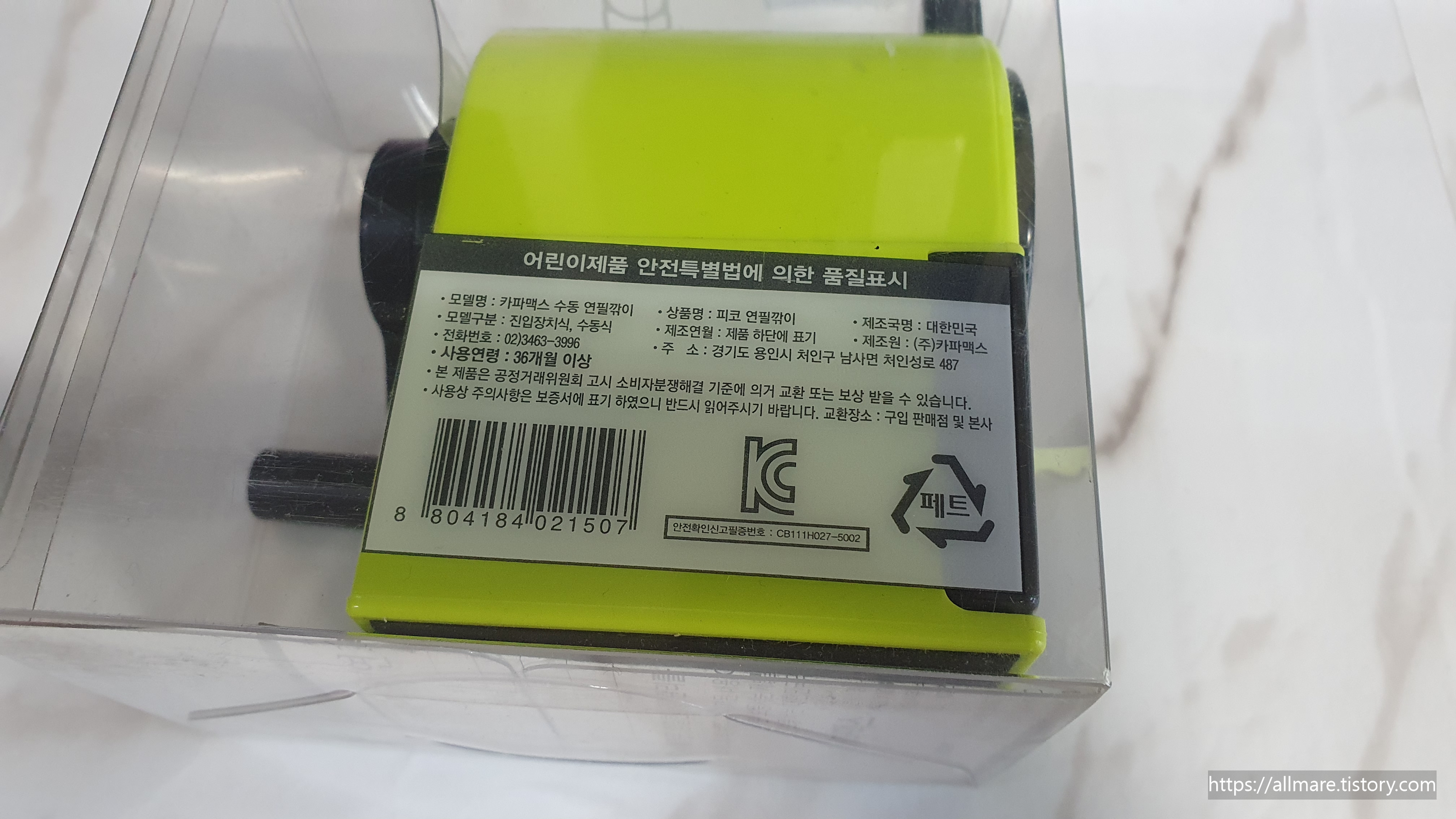 모델묭은 카파맥스 수동 연필깍이 / 상품명은 피코 연필깍이 / 제조국은 대한민국이네요 메이드인 코리아의 위엄!