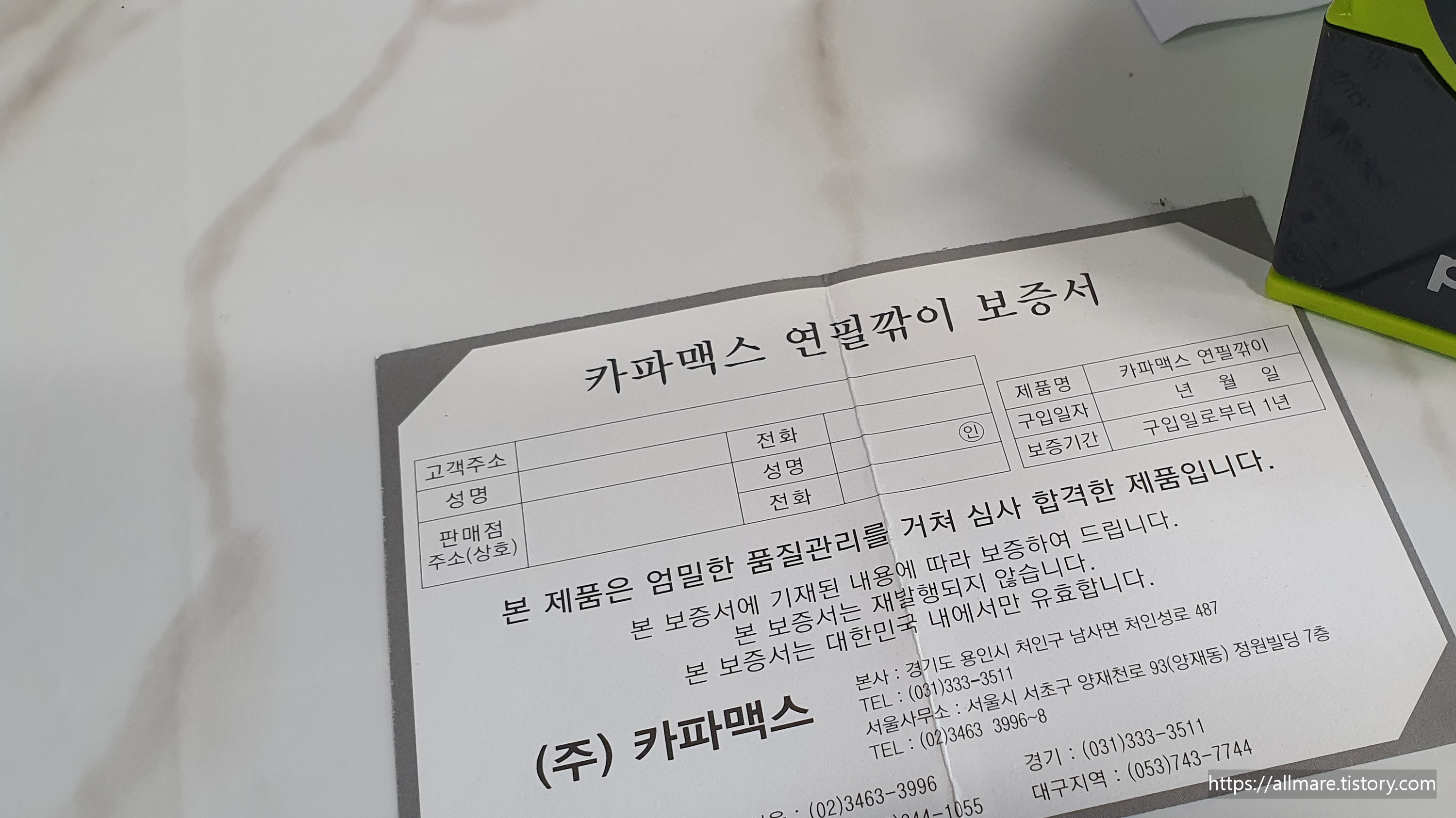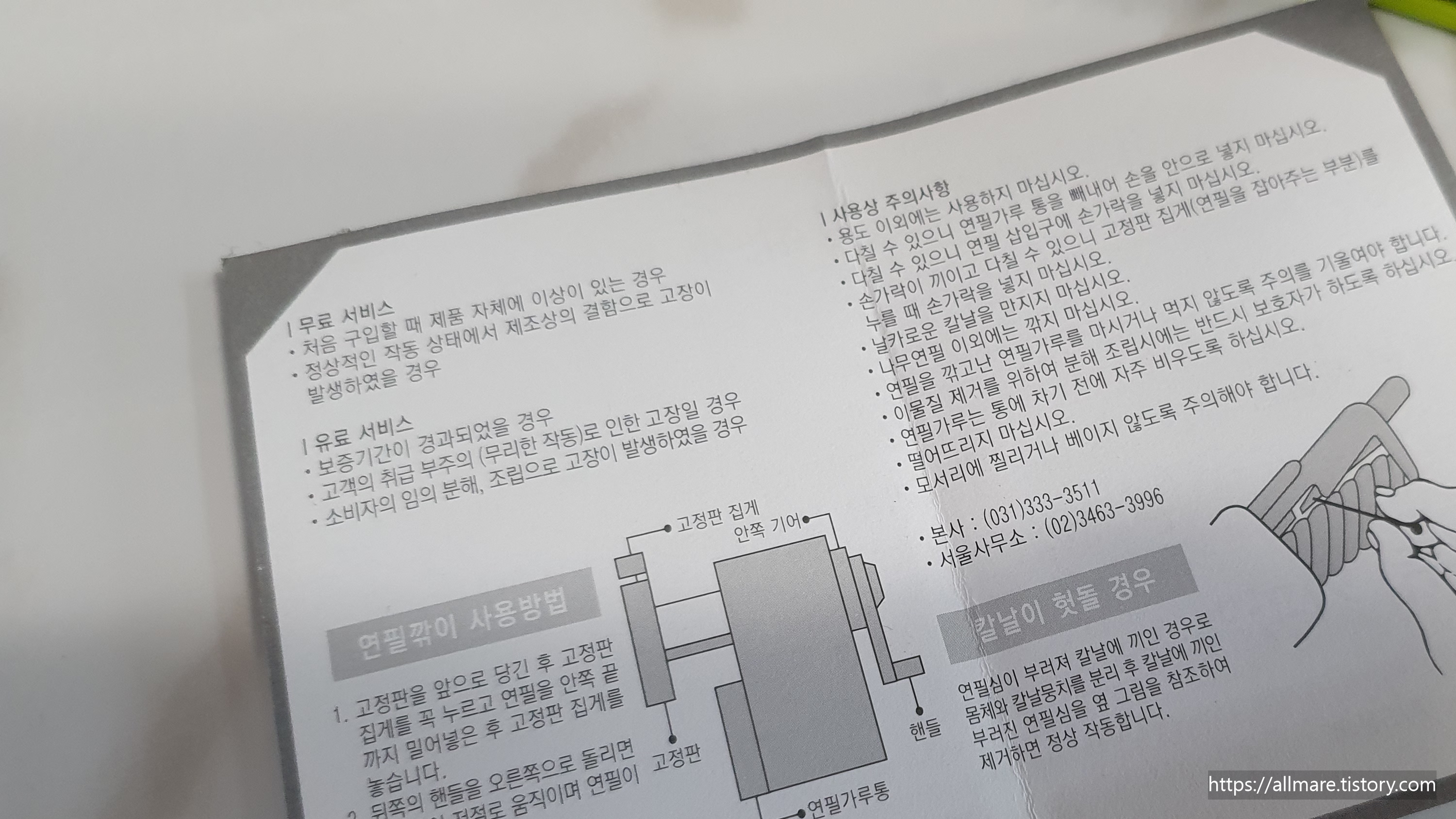 카파맥스 연필깎이 품질 보증서 뒷면에는 간단한 사용법 및 관리법이 나와있습니다.