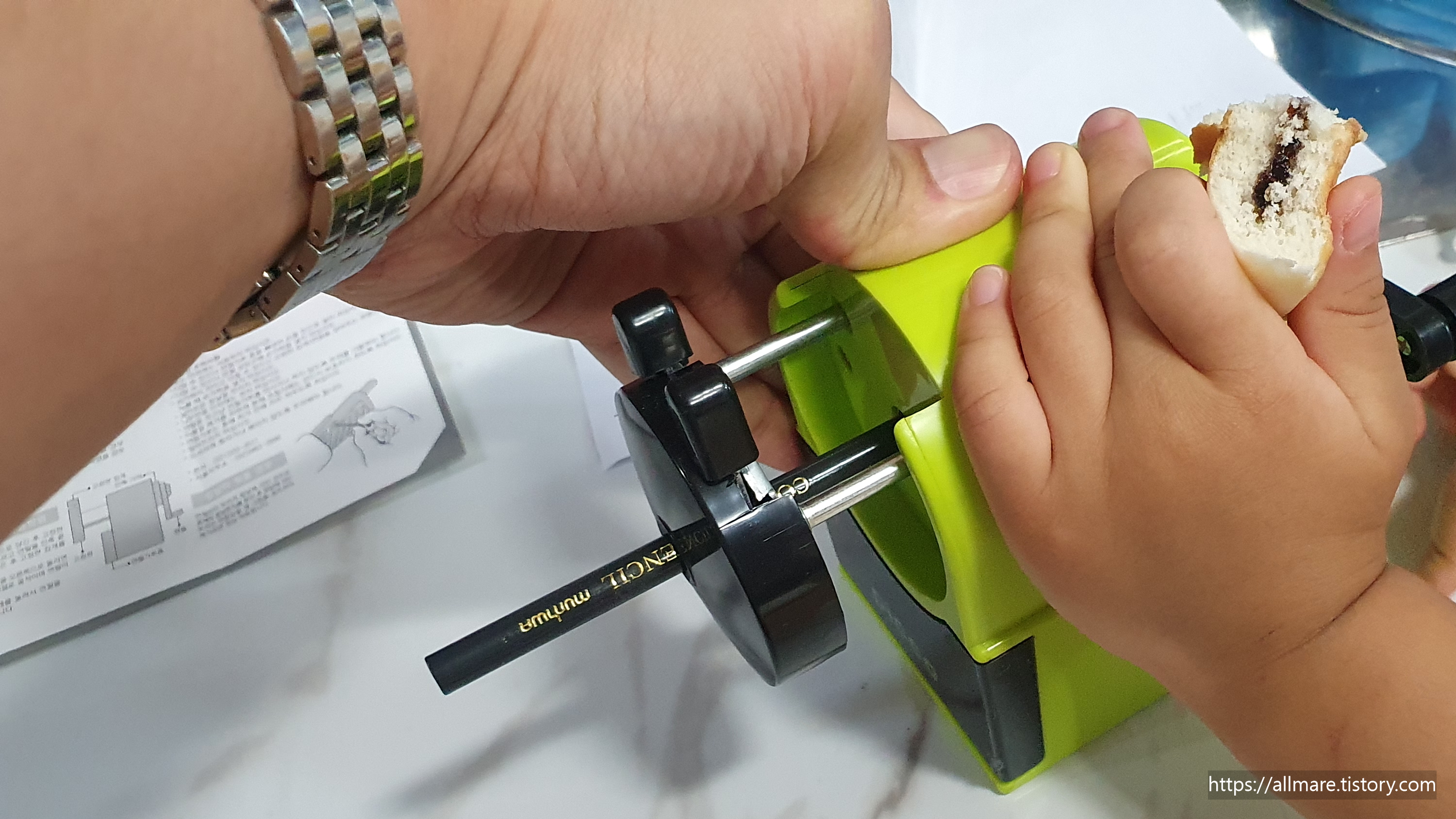 우리 둘째가 자기도 깍아보겠다며 빵먹다 뛰어 와서 열심히 돌리고 있네요!