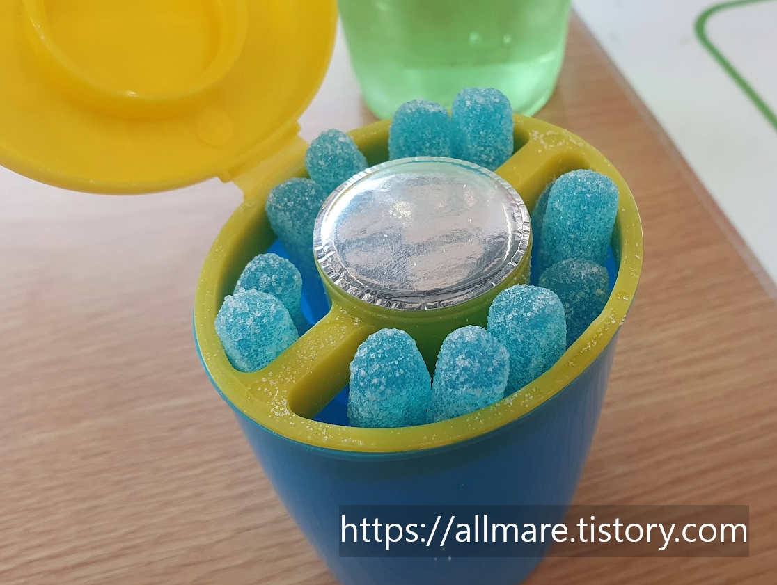 우선 젤리의 경우 소스를 찍어 먹어야 하는 특성상 다른 젤리류에 비해 약간은 단단한 느낌입니다. 가운데 찍어먹는 소스가 핵심인데 엄청 달고 상큼합니다. 젤리가 식감도 단단한 느낌과는 다르게 잘 씹힙니다. 하지만 일반적인 부드러운 젤리에 비하면 약간은 딱딱한 느낌이 들기도 합니다. 이 젤리는 양과 맛보다는 찍어먹는 즐거움 먹는 행위에 대한 즐거움을 주는 간식입니다. 가끔씩은 아이들이 사달라고 하는 간식거리 한 번씩은 사주는 것도 나쁘지는 안겠죠?